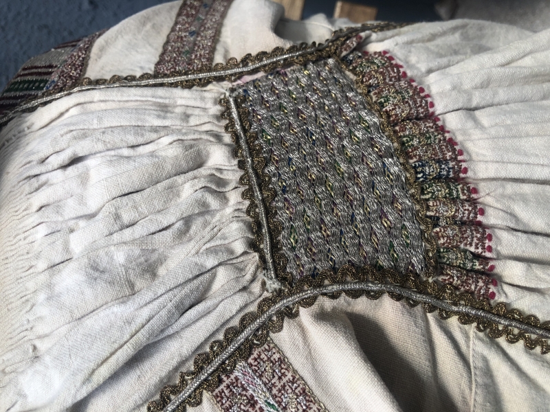 The blouse is part of  Bulgarian costume and its called Klinsci which has sleeves and collar sewn with gold and silver thread. In front around the neck is applied a Nagradnici breast, which is usually adorned with a dukat, then the coat called Zăbuni, a dark blue cloth coat, which are sewn with silver thread, but also applied with gold thread and many sequins, this garment is allowed only for the engaged and the young married.