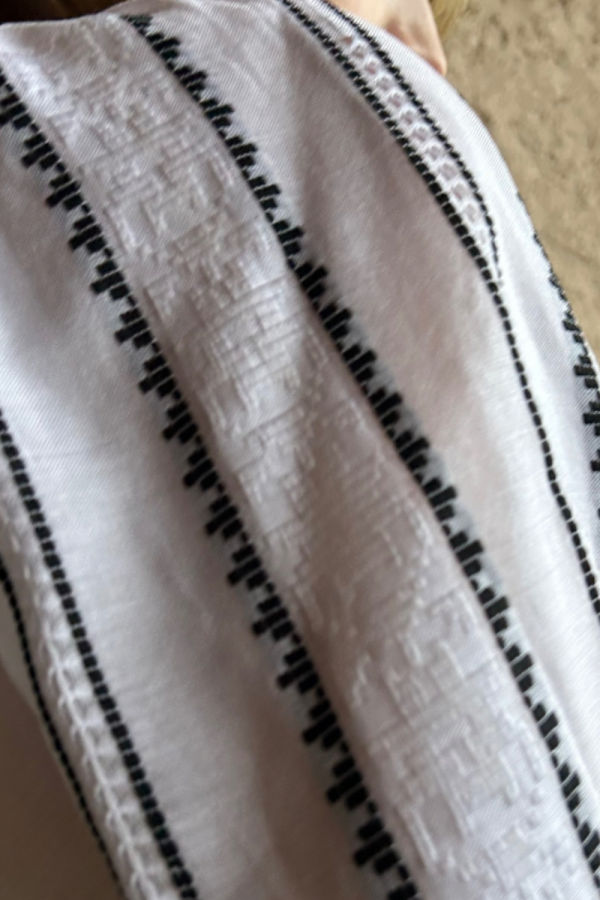 Design: Adorned with geometric embroidery in black and white, the blouse reflects the rich cultural heritage of Romanian art.