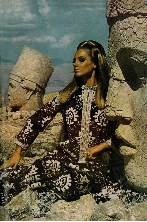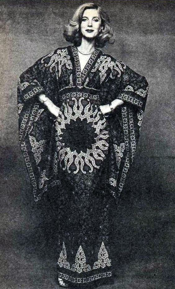 By 1966, Vogue described the kaftan as an essential garment for every member of the jet-set and photographed “the beautiful people” in an array of imported traditional styles and western adaptations, “Here are the most becoming fashions ever invented: the languor of the seraglio clings to them; leisure and repose emanate from them. The classic robes of the Near East, they’re now, suddenly all over the contemporary map—inspiration of great dressmakers and every woman’s discovery in beauty…”