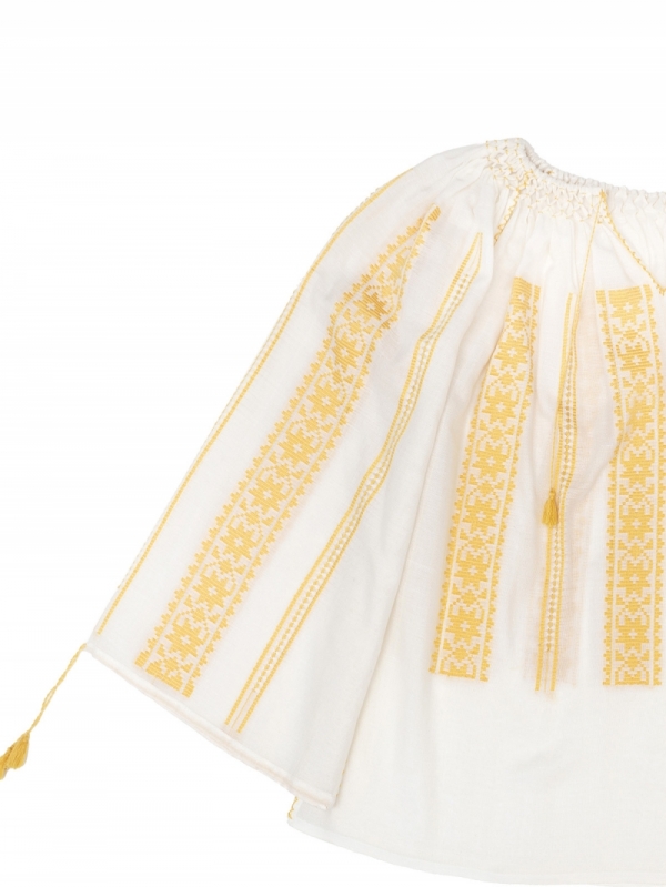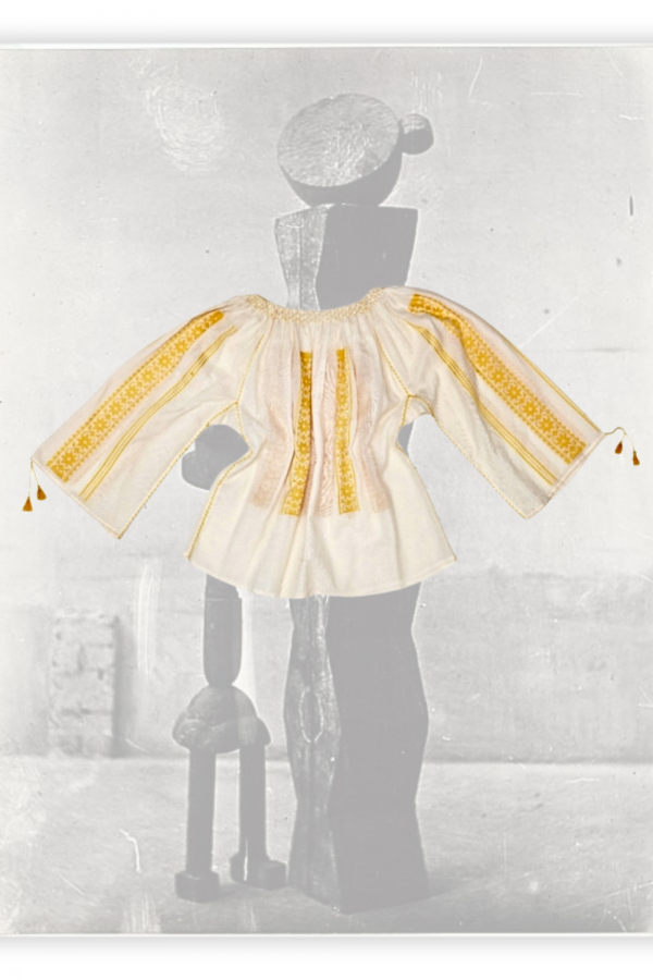 Starting from the natural fibers, especially cotton, the cloth and ornamentation are made entirely on the loom, while the joining seams, traditionally called 'cheițe' ('little keys'), are embroidered by hand. Traditionally, the collar has a honeycomb smocking and a drawstring that can be used to adjust according to the desired size. Drawstrings can also be found at the edge of the long sleeves, thus giving ease to the cut.