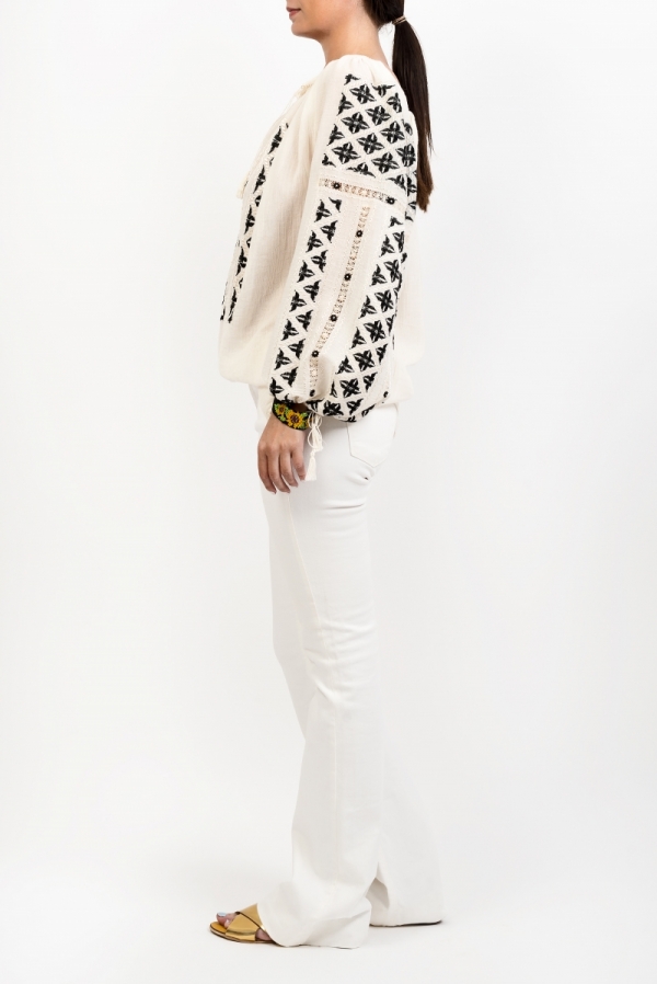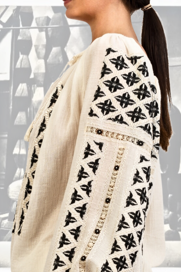 A feminine, delicate and romantic traditional Romanian blouse, suitable for a bohemian outfit that makes you think of a sunny holiday. The versatility of this type of blouse and its original design have influenced the international fashion scene over the years, beginning with the hippie style of the '70s and continuing with numerous contemporary designers - such as Altuzzara, Ulla Johnson and Isabel Marant - who have appropriated and adapted this piece in their high-end folk-inspired collections.