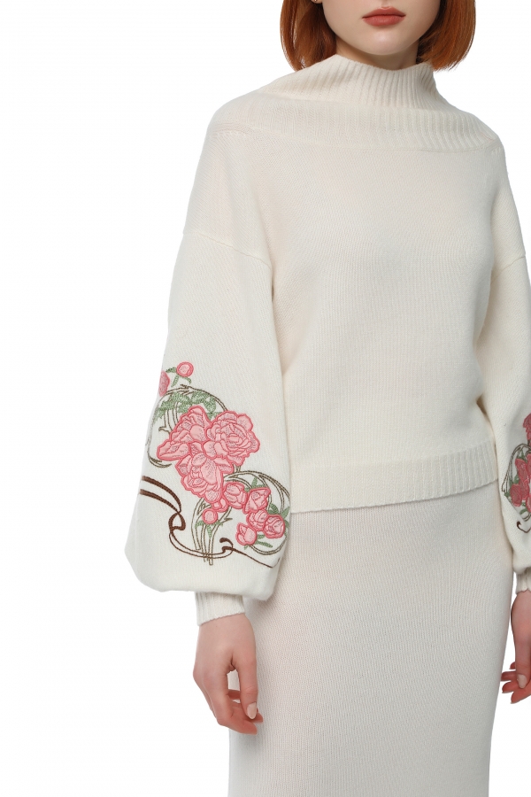 The cropped  jumper in boho style, featuring wide sleeves and a turtleneck, is made from 100% combed cashmere in an ice white color, sourced from nomadic herdsmen in Mongolia. It is finished with machine-embroidered flowers crafted using the silk appliqué technique. The feminine pattern is inspired by the textile design "Woman and the Daisy" by A.M. Mucha.