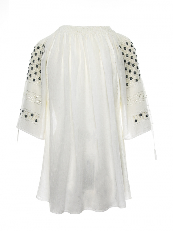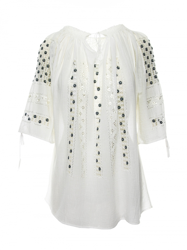 A feminine, delicate and romantic traditional Romanian blouse, suitable for a bohemian outfit that makes you think of a sunny holiday. The versatility of this type of blouse and its original design have influenced the international fashion scene over the years, beginning with the hippie style of the '70s and continuing with numerous contemporary designers - such as Altuzzara, Ulla Johnson and Isabel Marant - who have appropriated and adapted this piece in their high-end folk-inspired collections.