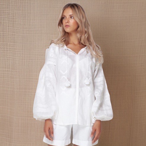 Decorated with geometric patterns in color of the fabric. Handmade elements on the neck and sleeves make this blouse a unique outfit in your wardrobe. Deep cut at the neck, 3 pairs of strings with handmade tassels, wide embroidered sleeves. Exquisite ornament, lightweight cut blouses complement your cruise look.