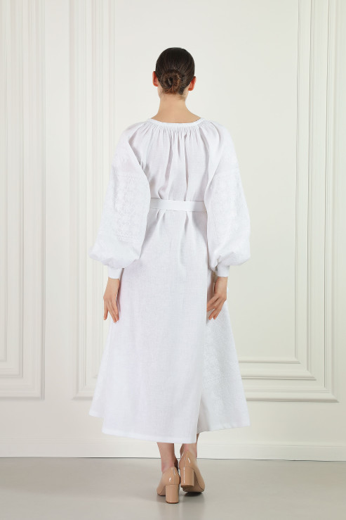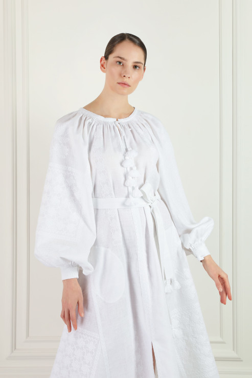 A tribute to timeless elegance and artisanal mastery, this long linen dress redefines modern refinement with impeccable craftsmanship. The delicate tone-on-tone embroidery adds depth and texture, revealing the beauty of handcrafted details. Voluminous, puffed sleeves—rooted in traditional heritage—bring a sense of movement and grace, while the gently gathered neckline, adorned with delicate tassels, enhances the dress’s romantic allure. Its relaxed silhouette, cinched with an adjustable belt, offers effortless sophistication, making it a perfect balance between tradition and contemporary fashion. This is a statement piece of refined ease and understated luxury.