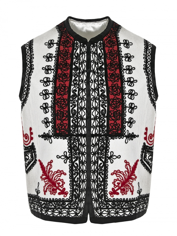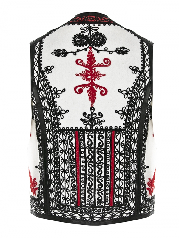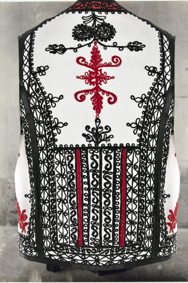 Traditionally, these authentic coats from Oltenia are made of white 'dimie' (80% wool and 20% cashmere fibers condensed and pressed together to become a felted cloth) and decorated with 'gîtane' (string made by twisting or braiding the wool/silk/metallic threads, appearing as an embroidery), which usually is applied on the joining seams of fabric panels or around the hems, with the purpose of hiding and strengthening the seams. All the coats and vests are crafted with an ancient embroidery machine from the 18th century in the traditional atelier of Tismana, Gorj county.