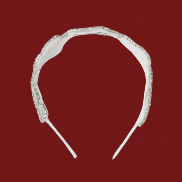 Bentiță elegantă, realizată manual din 5 flori delicate decorate cu cristale și elemente din sticlă argintie, perfectă pentru a adăuga un aer sofisticat unei ținute elegante sau de seară.
