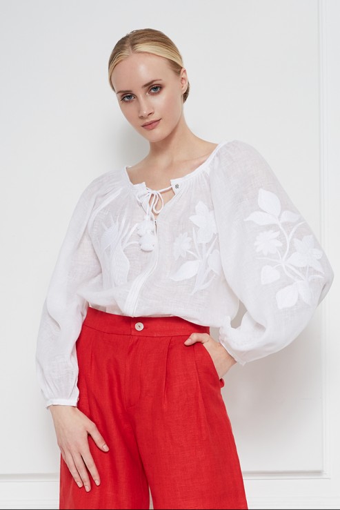 O bluză albă cu mâneci voluminoase. Decorata cu ornamente de designer în tonul țesăturii și snur cu ciucuri.