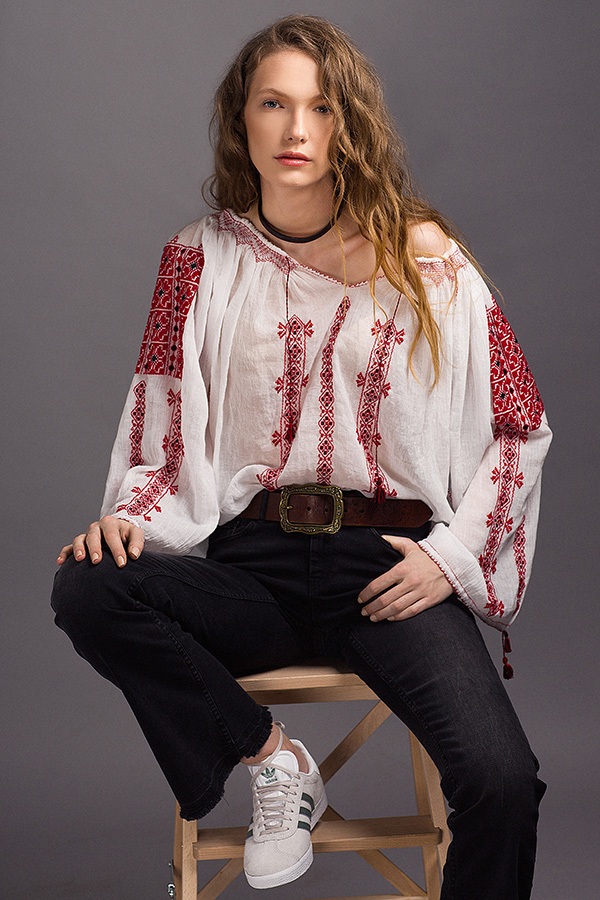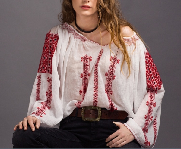 Ie romaneasca cu maneca lunga, cusuta  manual pe panza topita - bumbac cu broderie rosie. Iile se remarca prin motivele tesute specifice fiecarei zone geografice ale Romaniei. Atelierul mestesugari care creaza aceasta ie se afla in Transilvania.