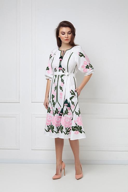Rochie din in, lungime medie, brodata cu ornament verzi și roz autentic ucrainean pe toată lungimea produsului.