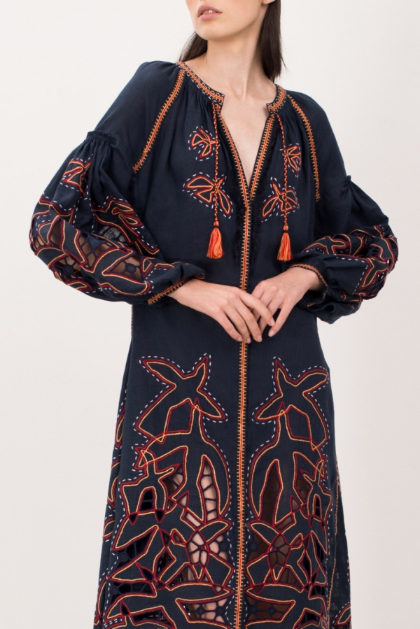Rochia de lungime midi este realizată din in de înaltă calitate. Gulerul rochiei este decorat cu mărgele galvanizate aurii și ciucuri. Rochia are închidere cu nasturi, buzunare laterale și o curea cu ciucuri colorați. Modelul rochiei prezintă păsări, inspirat de pictura artistei britanice Sophie Wake "Flying Home".