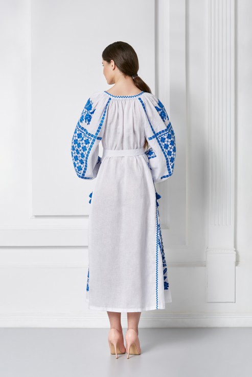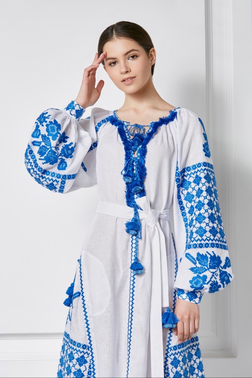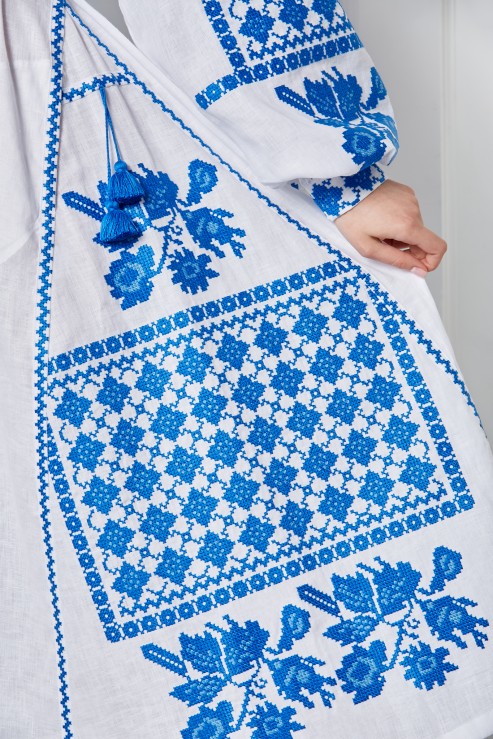 Rochie traditionala moderna  de lux midi albă, cu o cusătură albastră autentică. Decolteul decorat cu franjuri voluminoase. Gâtul și centura sunt completate cu ciucuri pe două niveluri care se potrivesc cu broderia. Mansetele sunt decorate cu cusături autentice lucrate manual - „zbyranka”. Tivul rochiei are o fustă cu pene decorate abundent.